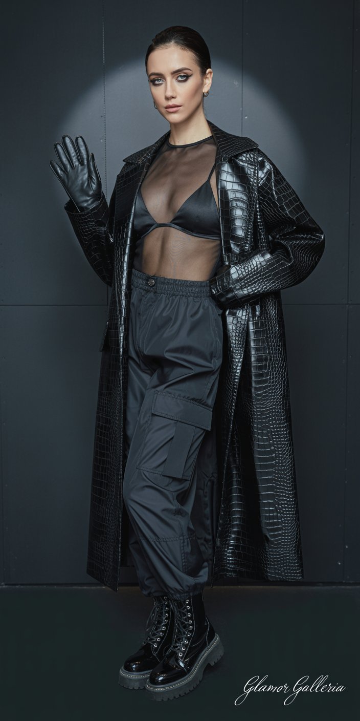 With black, texture is king: crocodile embossing, parachute nylon, mesh, and satin create a dimensional “all-black” that photographs like sculpture. Mirror the shine with patent leather gloves on cold days.