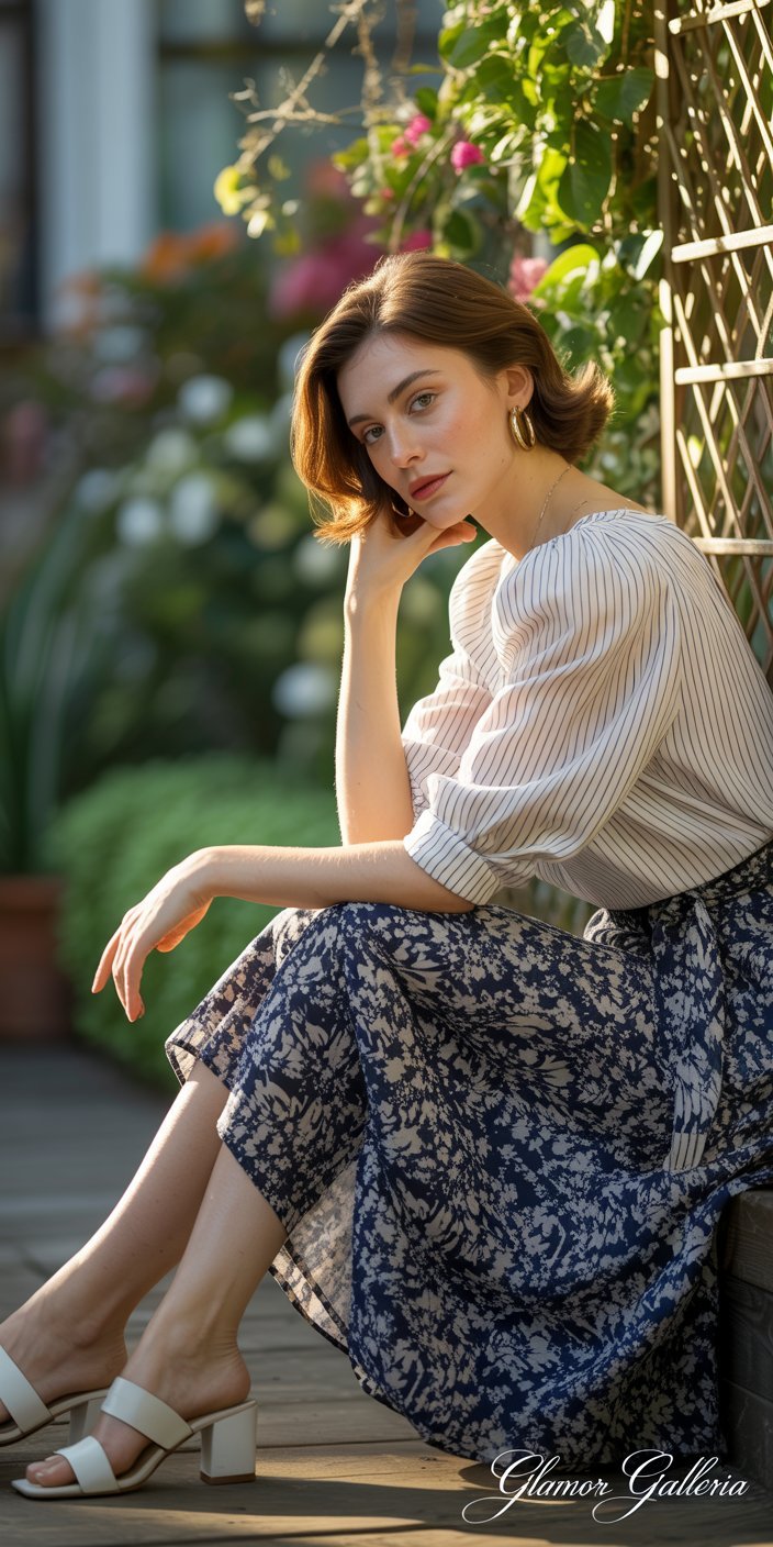 With two statement patterns already in play, opt for simple jewelry and shoes. Delicate hoops or a thin pendant won’t compete with your prints. A minimalist leather pump or strappy sandal allows your stripe-and-floral combination to remain the star.