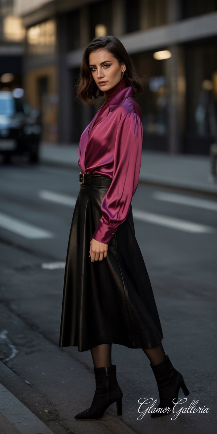 - Black Foundation: A black leather skirt or tailored trousers set a dramatic stage.