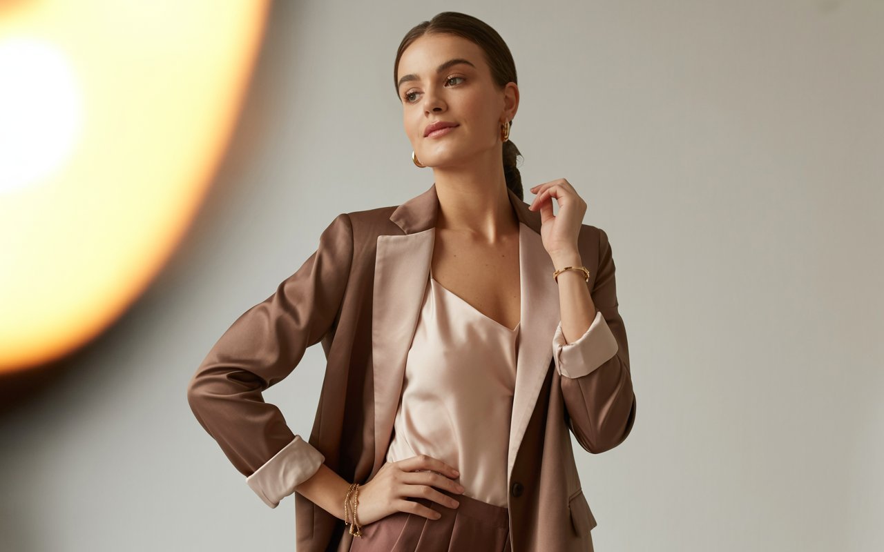 - Base Layer: Start with a neutral canvas—think ivory blouse and taupe tailored trousers.