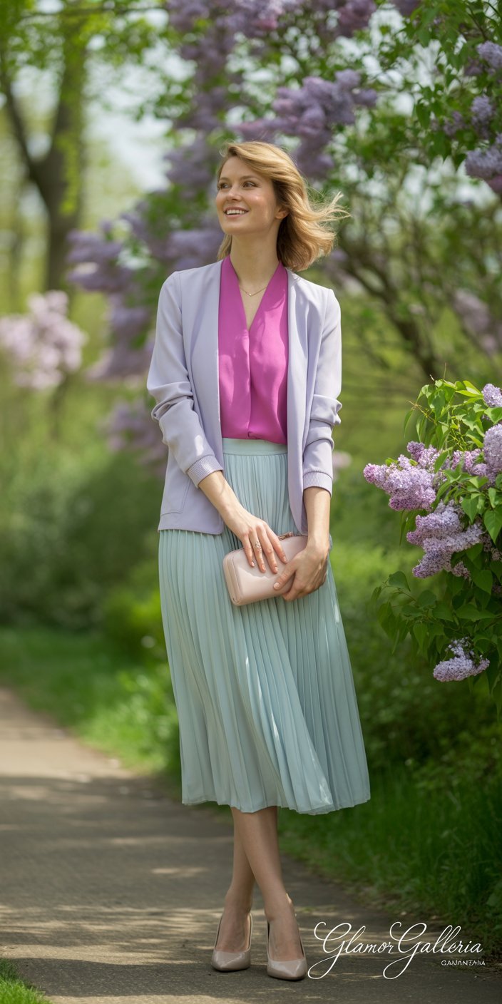 Tip: A pastel pleated skirt and Viva Magenta blouse feel unexpectedly harmonious.