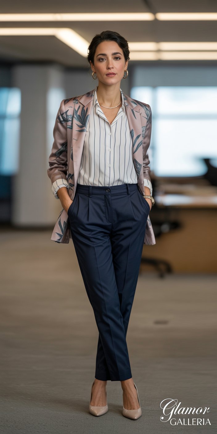• Stripes + florals: A vertical-stripe shirt under a muted floral blazer adds dimension without drama.