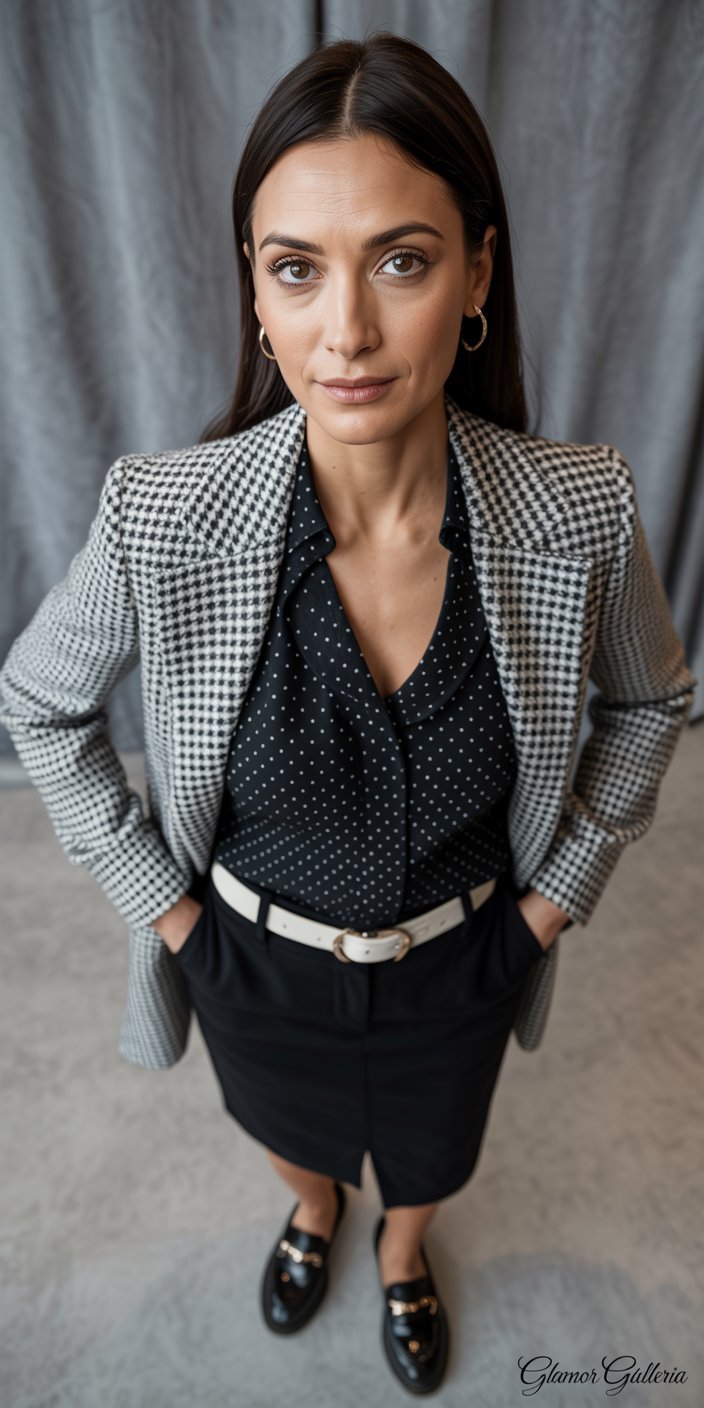 • Monochrome mix: Black-and-white houndstooth blazer with a black-and-white polka-dot blouse.