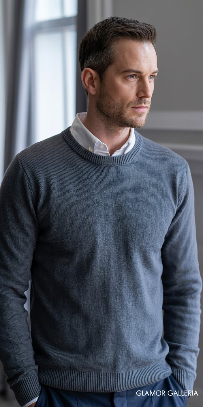 A fine-gauge merino or cashmere crewneck in a neutral hue provides warmth and texture without bulk. It layers beautifully under jackets or over shirts.