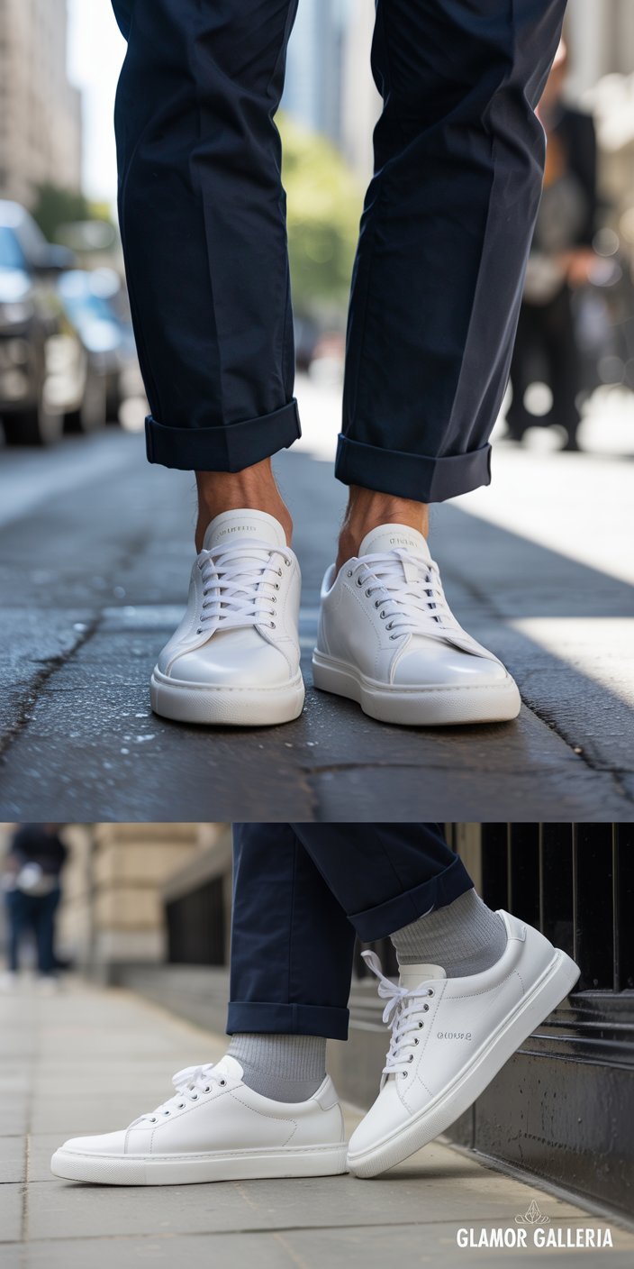 Clean, all-white leather kicks instantly polish off any look. They’re dressy-casual all-stars that complement suits as well as jeans.