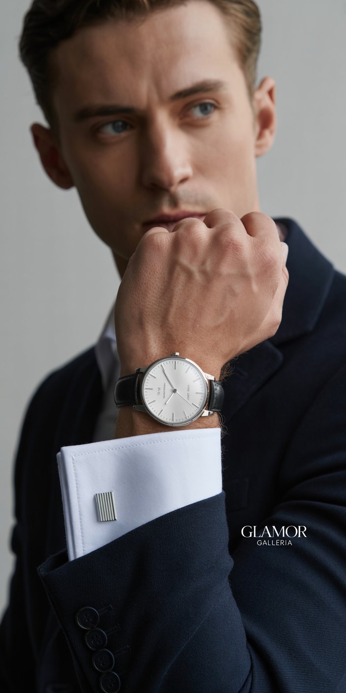 A minimalist watch with a leather or stainless-steel band signals sophistication. Choose a face that’s 38–42 mm for balanced proportions.
