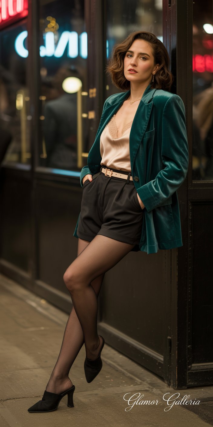 5. Velvet Blazer + Satin Cami + Tailored Shorts + Sheer Tights