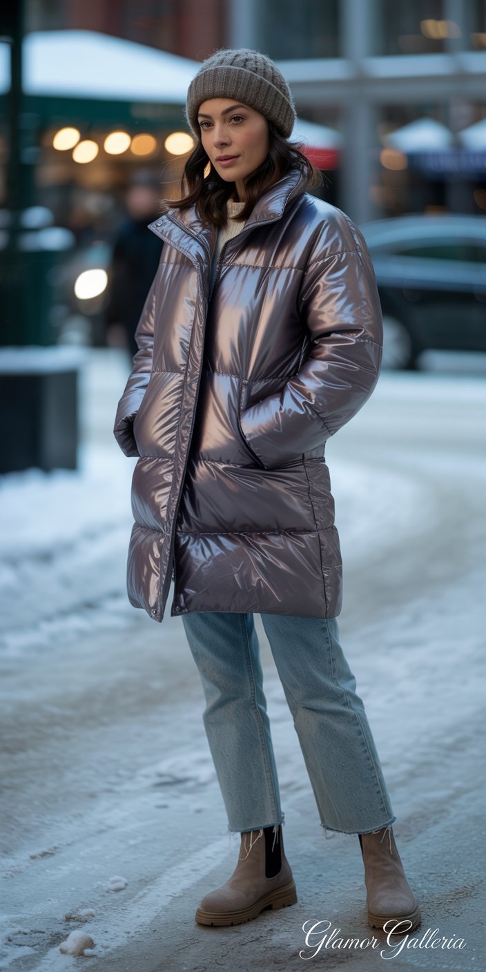 Why It Works: The glossy puffer reflects light, while the denim’s frayed edge adds a lived-in feel. Suede softens the metallic shine.
