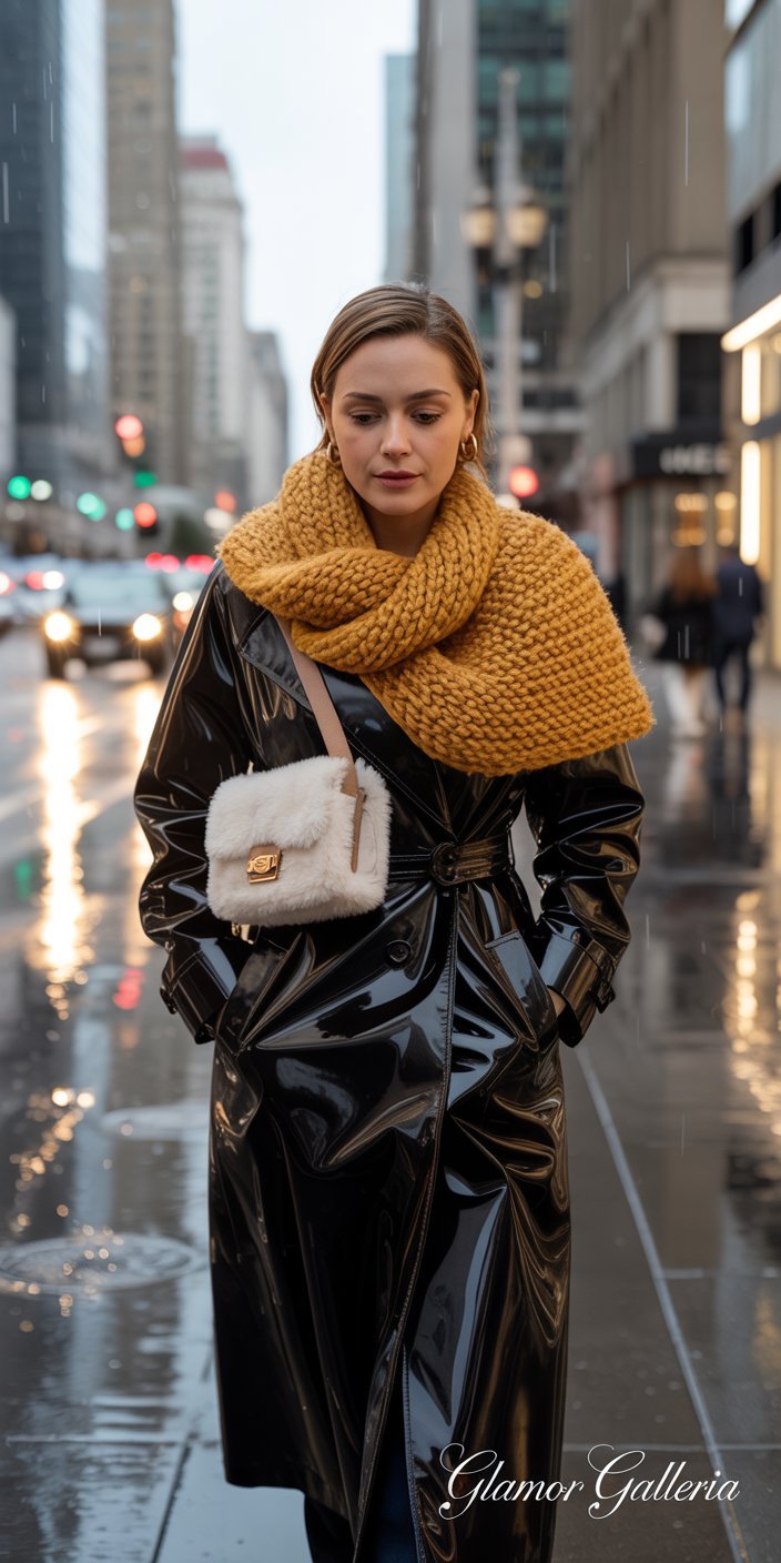 7. Patent Leather Trench + Chunky Knit Scarf + Faux-Shearling Bag