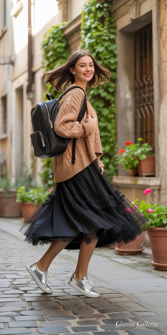 3. Midi Tulle Skirt + Chunky Knit Sweater + Metallic Sneakers