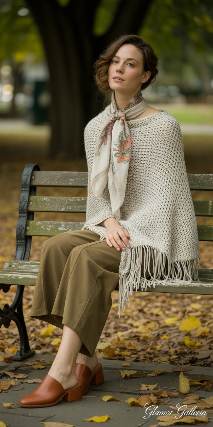 12. Knitted Poncho + Suede Culottes + Silk Scarf + Mules