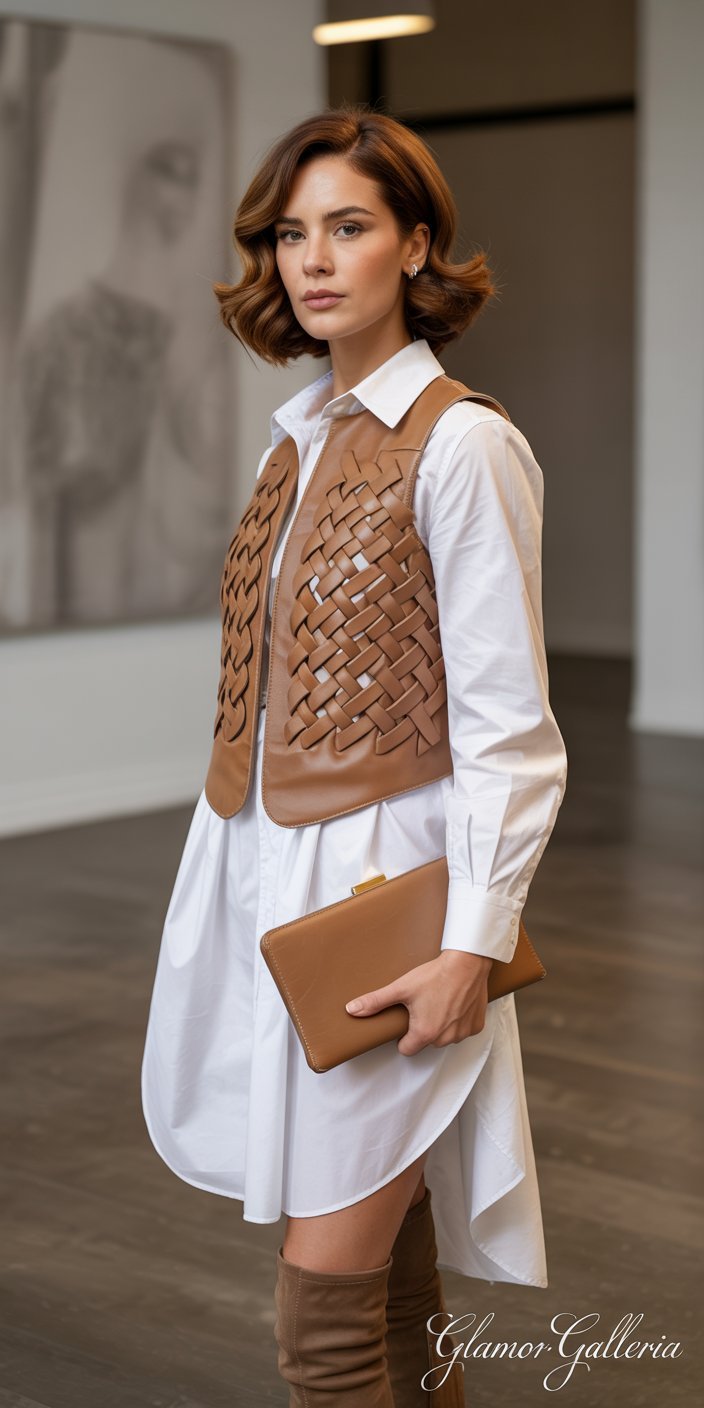 11. Woven Leather Vest + Cotton Poplin Shirt Dress + Over-The-Knee Boots
