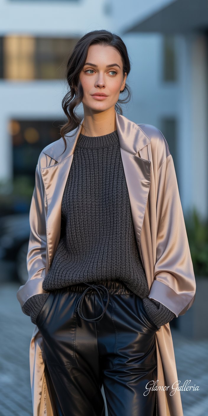 10. Satin Duster + Chunky Wool Sweater + Leather Joggers + Sneakers