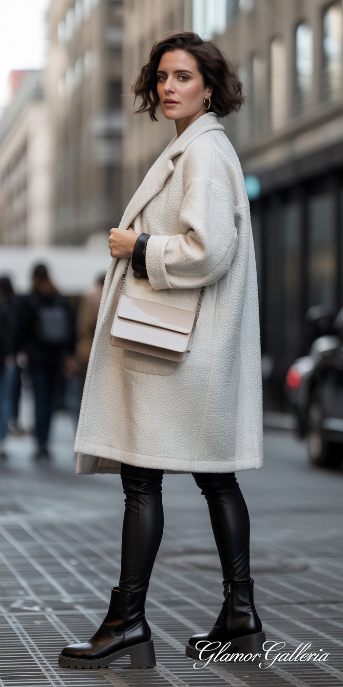 1. Fuzzy Bouclé Coat + Sleek Leather Leggings + Chunky Boots