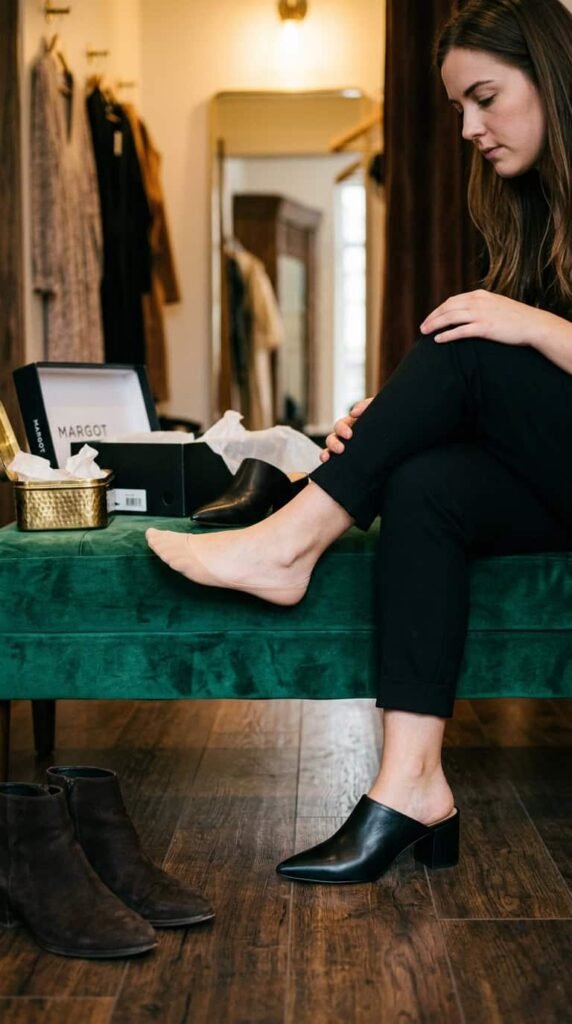 Around $130. The slip-on mule that looks like a heel but you can actually walk to dinner in. Black leather with a 2-inch block heel. The shoe I reach for 80 percent of the time for date night.