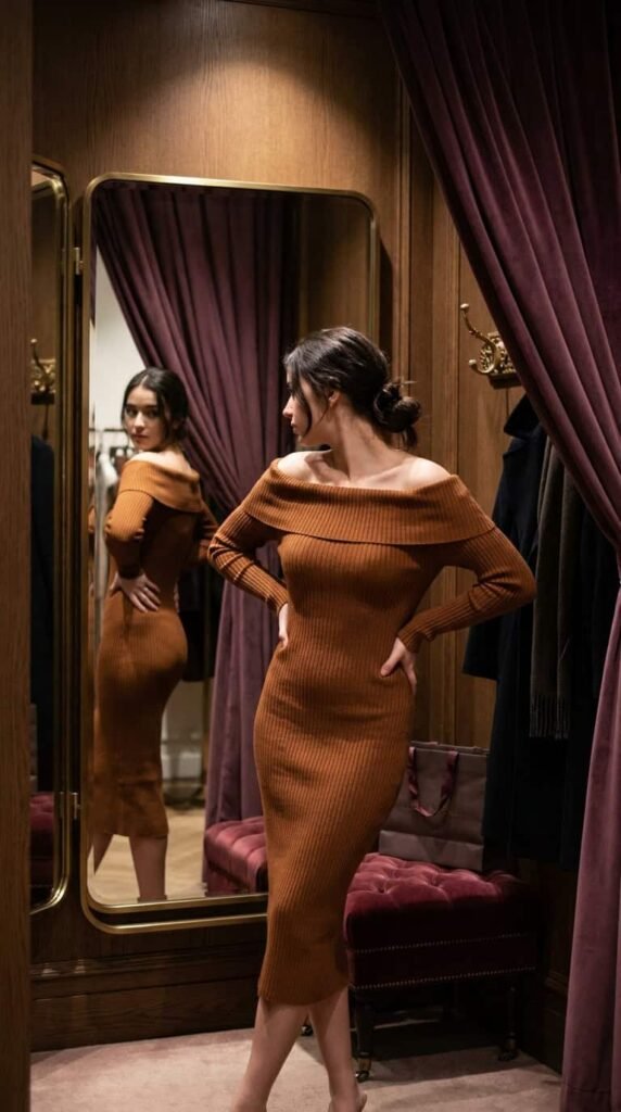Around $129. For a winter date when you want to look good but not freeze. Fitted ribbed knit, off-shoulder neckline, midi length. Warm, elegant, and the neckline does all the flirting for you. Size down — the knit stretches.