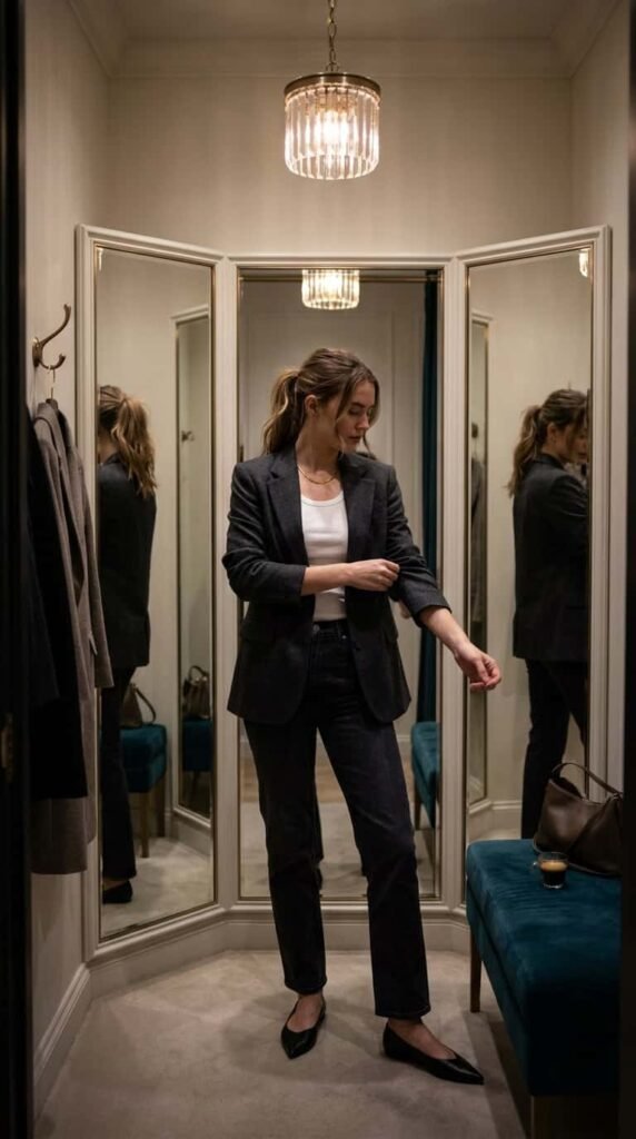 Zara oversized blazer ($89), Hanes tank ($18 for 3), Agolde 90s jeans ($198). This is the casual-chic date night uniform that looks expensive because of the proportions. Slightly oversized blazer, fitted tank, straight-leg jeans. Add pointed flats. Date night outfit code for “confident, not desperate.”