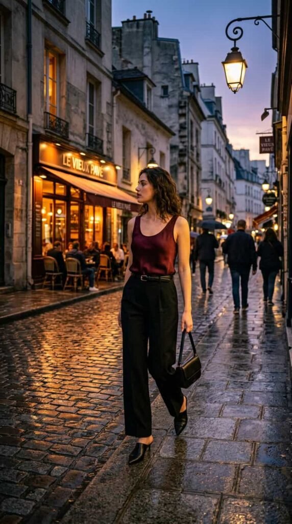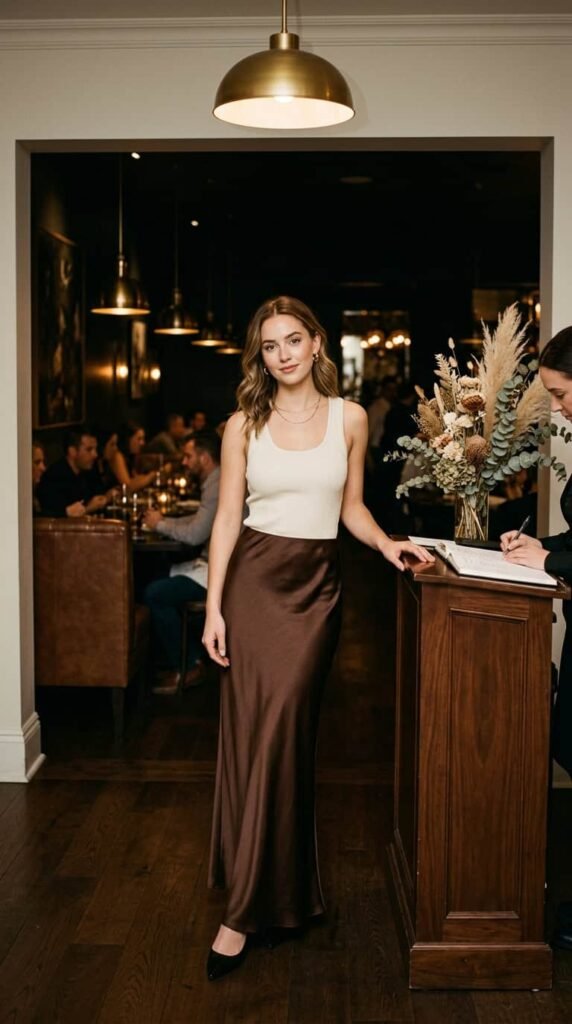 Abercrombie Sloane trousers ($90) with a satin tank ($45). Black or chocolate trousers with a contrasting satin tank — cream, blush, or deep burgundy. Tuck the tank in and add a statement belt. For a nicer restaurant where jeans would feel too casual.