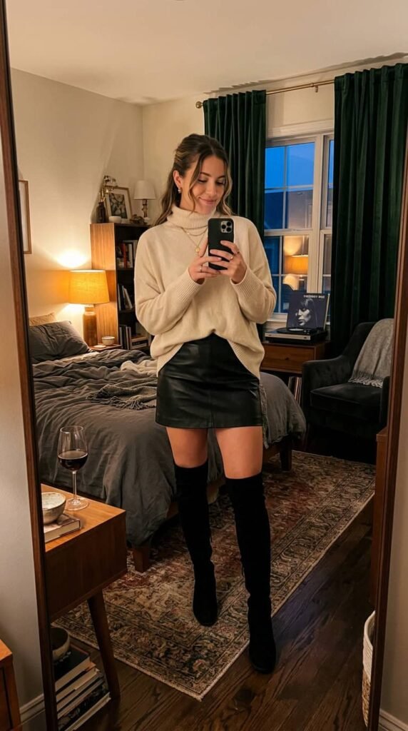Zara leather mini skirt ($70) with a slouchy cashmere turtleneck from J.Crew ($128). Legs-plus-covered-up is the date night outfit formula for fall. Add tall boots. I’ve sent friends this exact combination and they’ve all reported back positively.