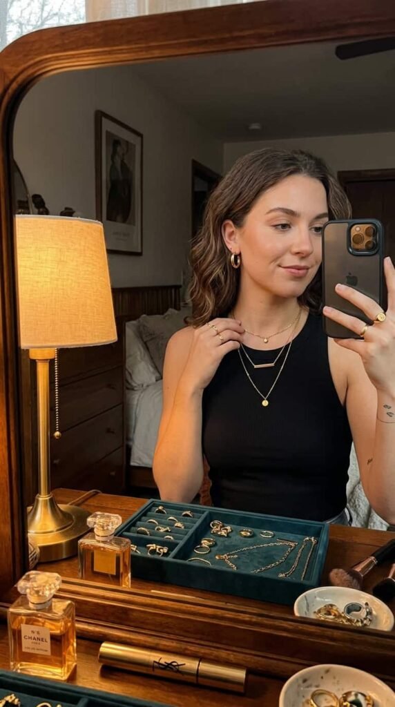 Mejuri hoops ($128) + layered Mejuri necklaces ($98 each). Gold warms up any outfit in candlelight. Three layered chains at different lengths is the accessory formula that makes a plain tank look intentional.