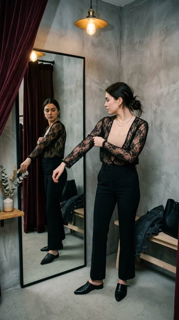 A sheer lace blouse ($89 at Zara) worn over a nude seamless bra, tucked into black tailored trousers. The 2026 “naked dressing” trend for women who don’t actually want to be naked. It reads bold without showing anything. My most-complimented recent outfit.