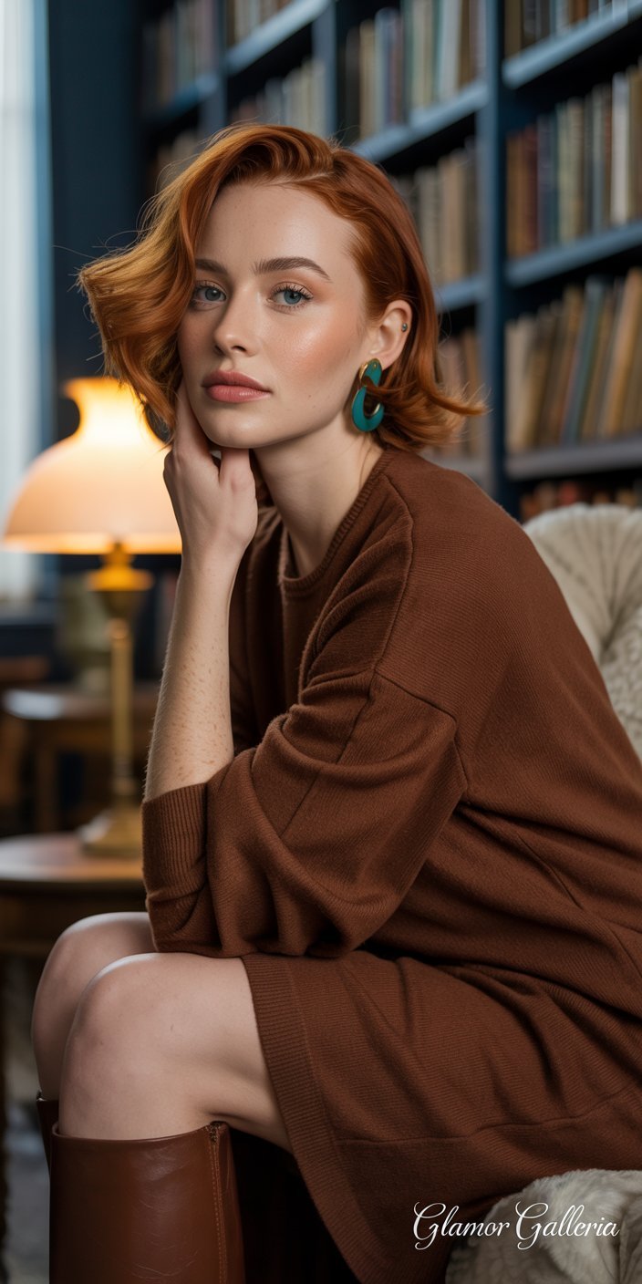 - Styling Tip: Turquoise statement earrings with a chocolate brown sweater dress.