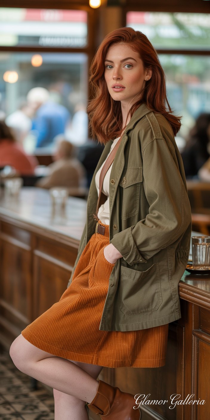 - Styling Tip: Burnt orange corduroy skirt paired with an olive utility jacket for a chic outdoorsy look.