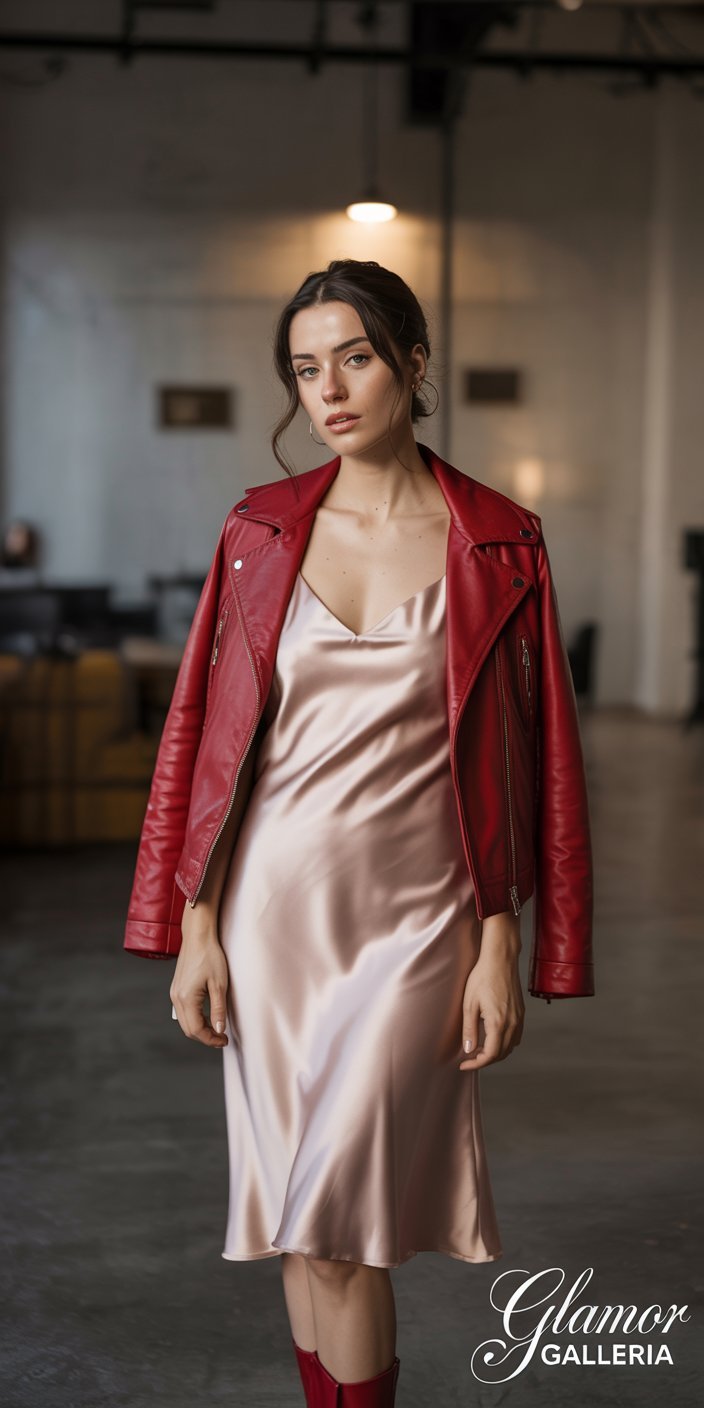 - Styling Tip: Swap your usual red dress for one in blush and top it with a crimson leather jacket.