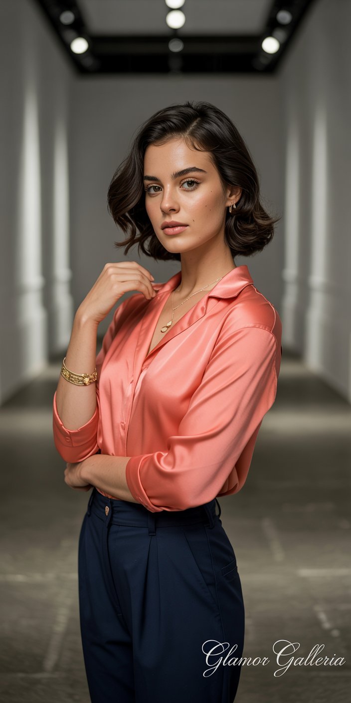 - Styling Tip: Coral blouse tucked into navy high-waisted pants; add gold jewelry for a polished result.