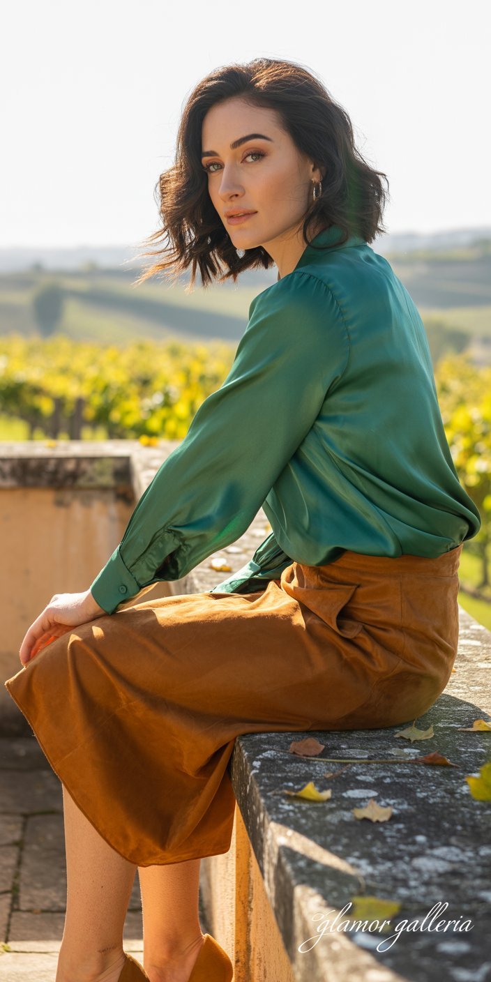 - Styling Tip: Emerald silk top under a burnt sienna suede skirt.