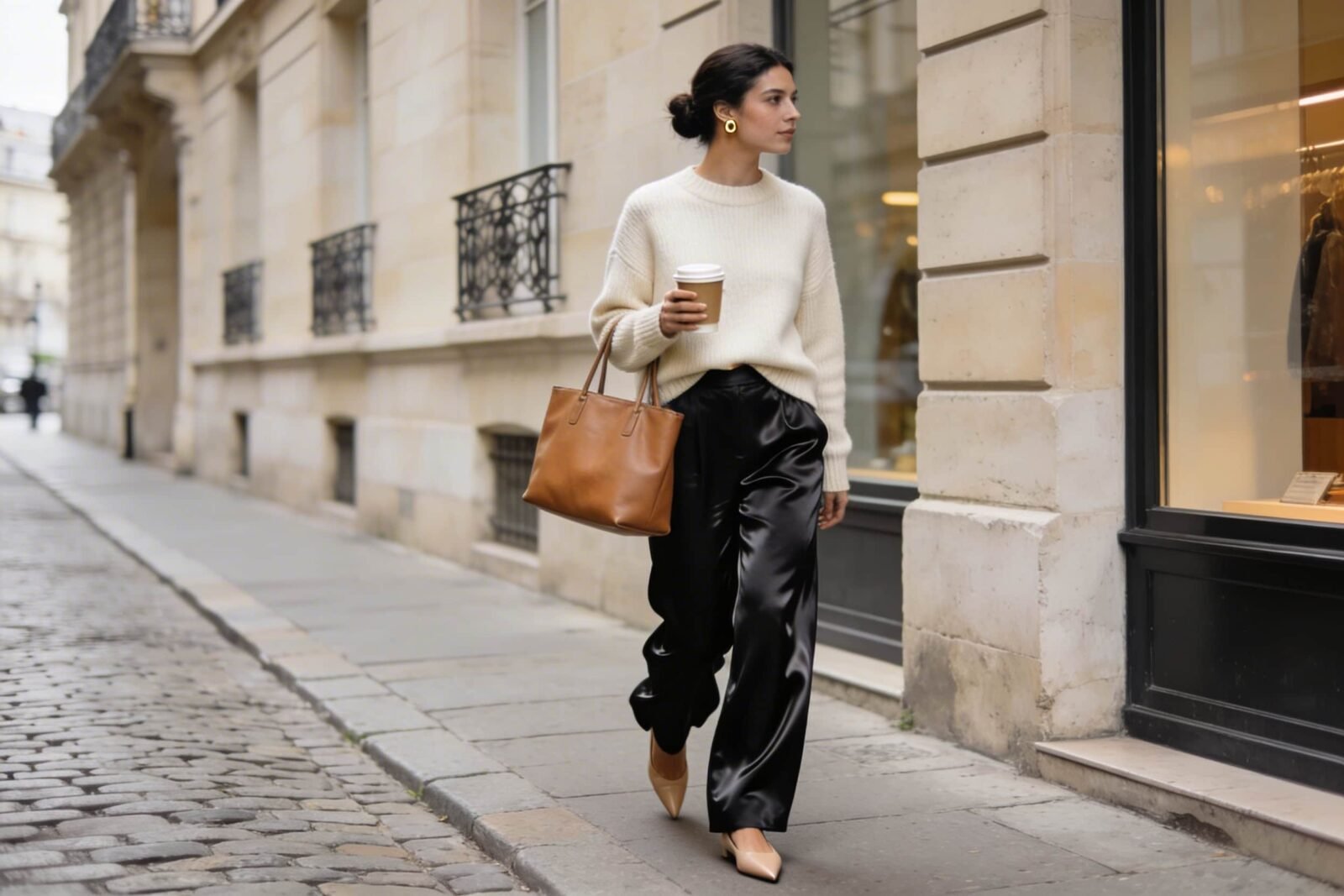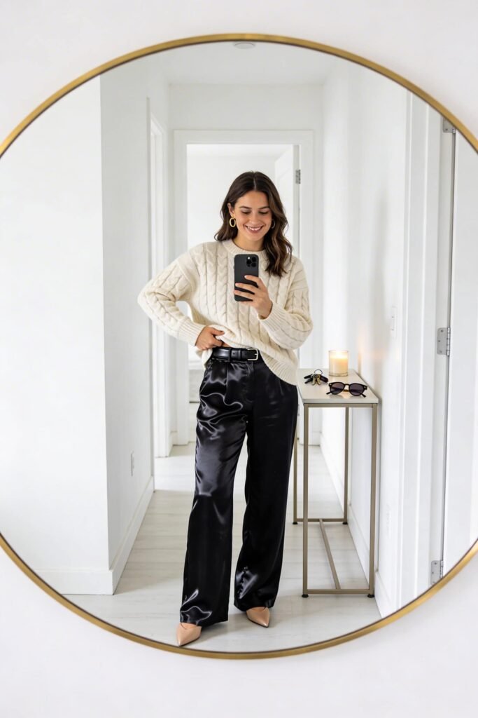 The outfit that Who What Wear called “easy elegance personified” for 2026. A soft cream cashmere crewneck half-tucked into wide-leg satin trousers in black or navy. The texture contrast — matte knit against liquid sheen — makes this look twice as expensive as it is.