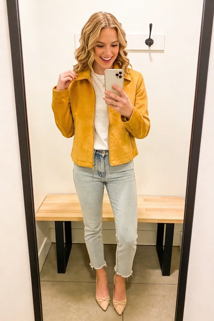 10. Butter Yellow Suede Jacket + Straight Jeans
