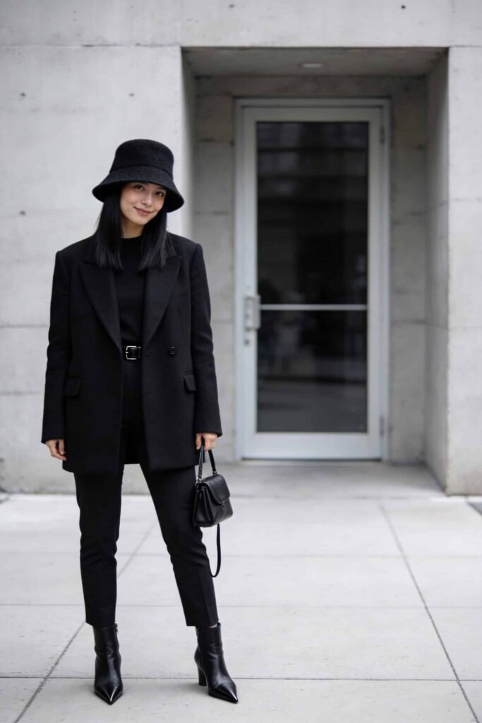 Minimalist cool. A head-to-toe black outfit — wool coat, slim pants, ankle boots — with one statement accessory: a structured wool bucket hat. The hat becomes the focal point and elevates basic black from “lazy” to “intentional.”