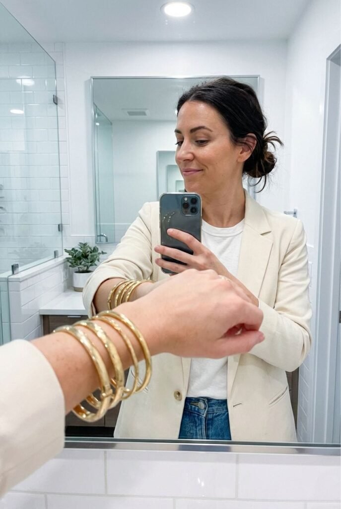 Stylist Tinsley Crisp at The Everygirl says a bangle stack “quietly transformed the way I get dressed.” Wear three to five gold bangles with the simplest outfit — white tee, jeans, blazer — and suddenly the whole look has intention. Jenny Bird’s hinged bangles are the editor favorite.