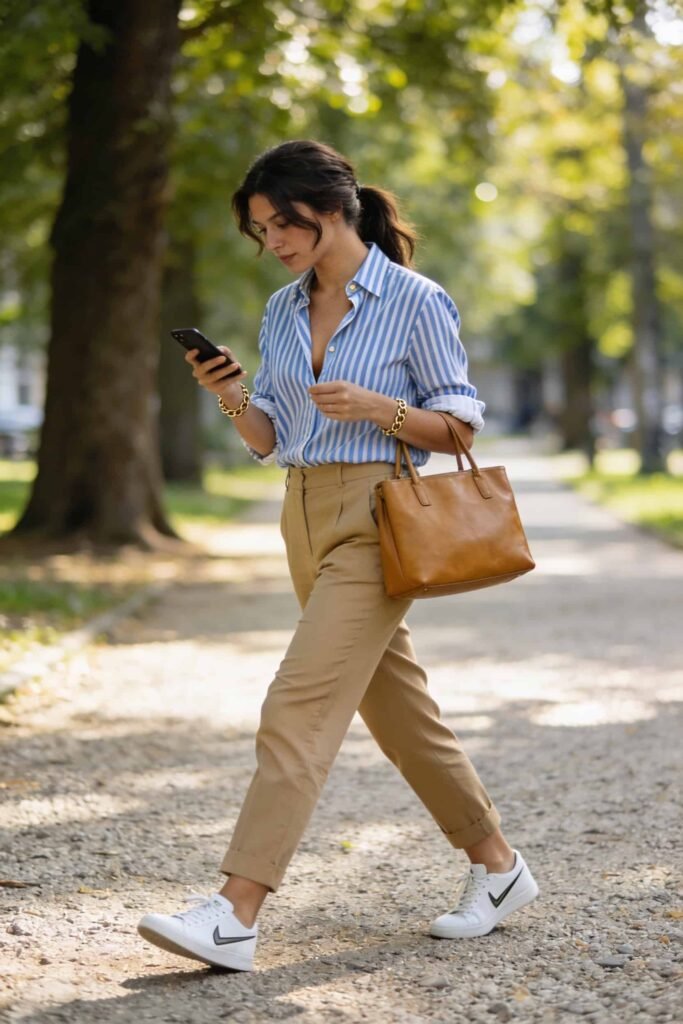 15. Relaxed Trousers + Striped Shirt + Low Sneakers