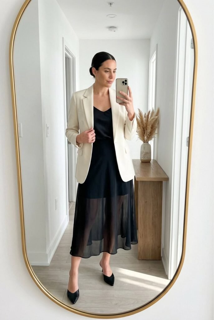 Shop it: Zara sheer midi skirt ($40–$50) + your existing blazer. Total new spend: under $50.