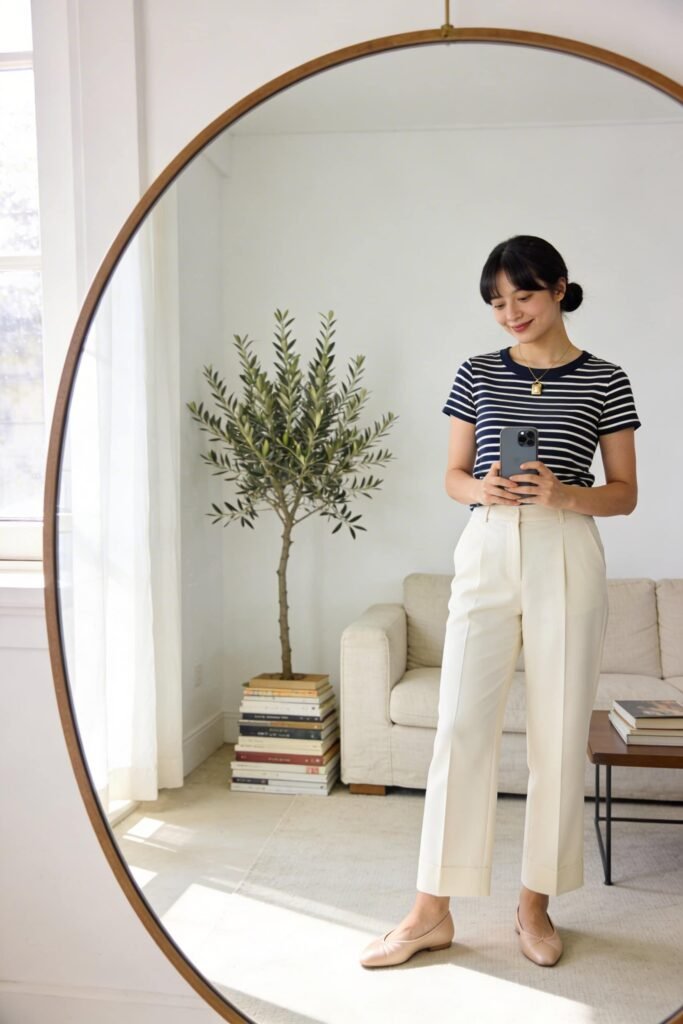 The ultimate “quiet luxury” outfit that Who What Wear’s capsule wardrobe guide flagged as a 2026 essential. A boatneck tee (think Breton-stripe or solid ivory), wide-leg tailored trousers, and soft ballet flats. It looks like you spend summers in the South of France even if you don’t.