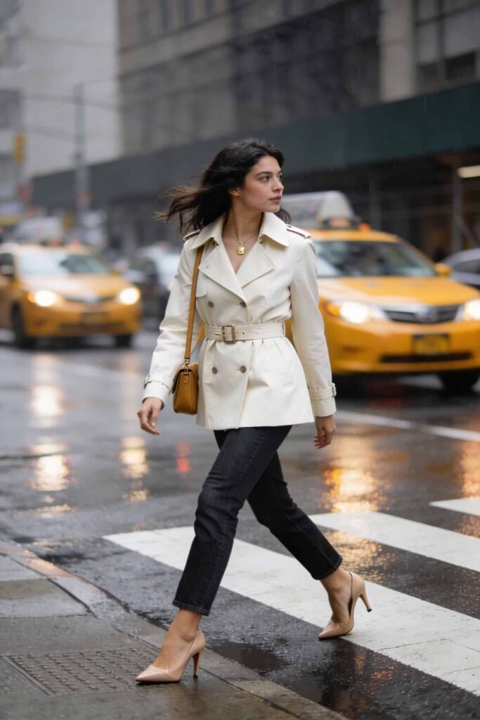 The 2026 trench is shorter and lighter. A cream cropped trench over dark wash straight jeans and nude kitten-heel slingbacks is the look every fashion editor from London to Milan is wearing right now, per Who What Wear’s street style coverage.