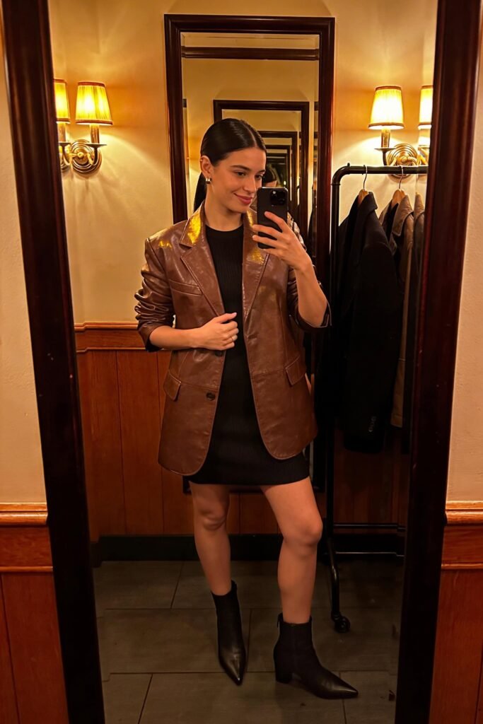Shop it: Zara faux-leather blazer ($70–$90) + Mango knit dress ($40–$60).