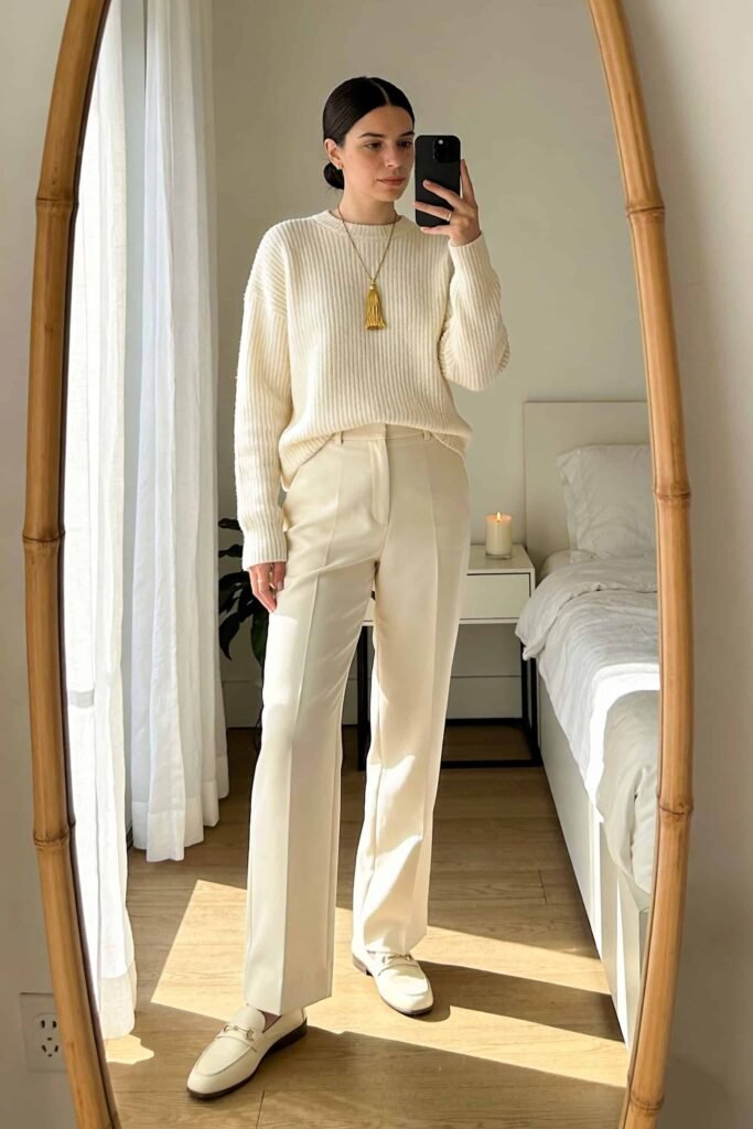 Cream sweater, cream wide-leg trousers, cream loafers. The monochrome approach eliminates decision fatigue and looks insanely polished. The key is varying textures — ribbed knit, smooth satin, leather or suede shoe. A tassel pendant necklace adds the focal point.