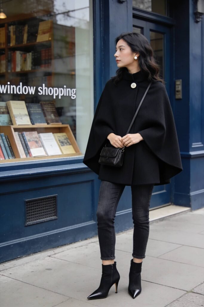 Shop it: COS or Mango cape coat ($90–$170) + dark jeans ($50) + kitten boots ($60–$80).
