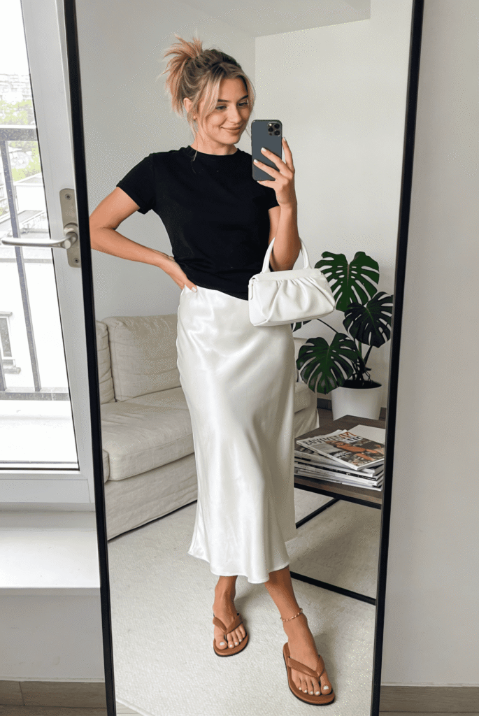 The unexpected combination that works. A white or cream satin midi skirt, a fitted black tee, leather flip-flops, and a crisp white handbag. Going fully monochrome with one texture pop (the satin) creates effortless summer elegance.