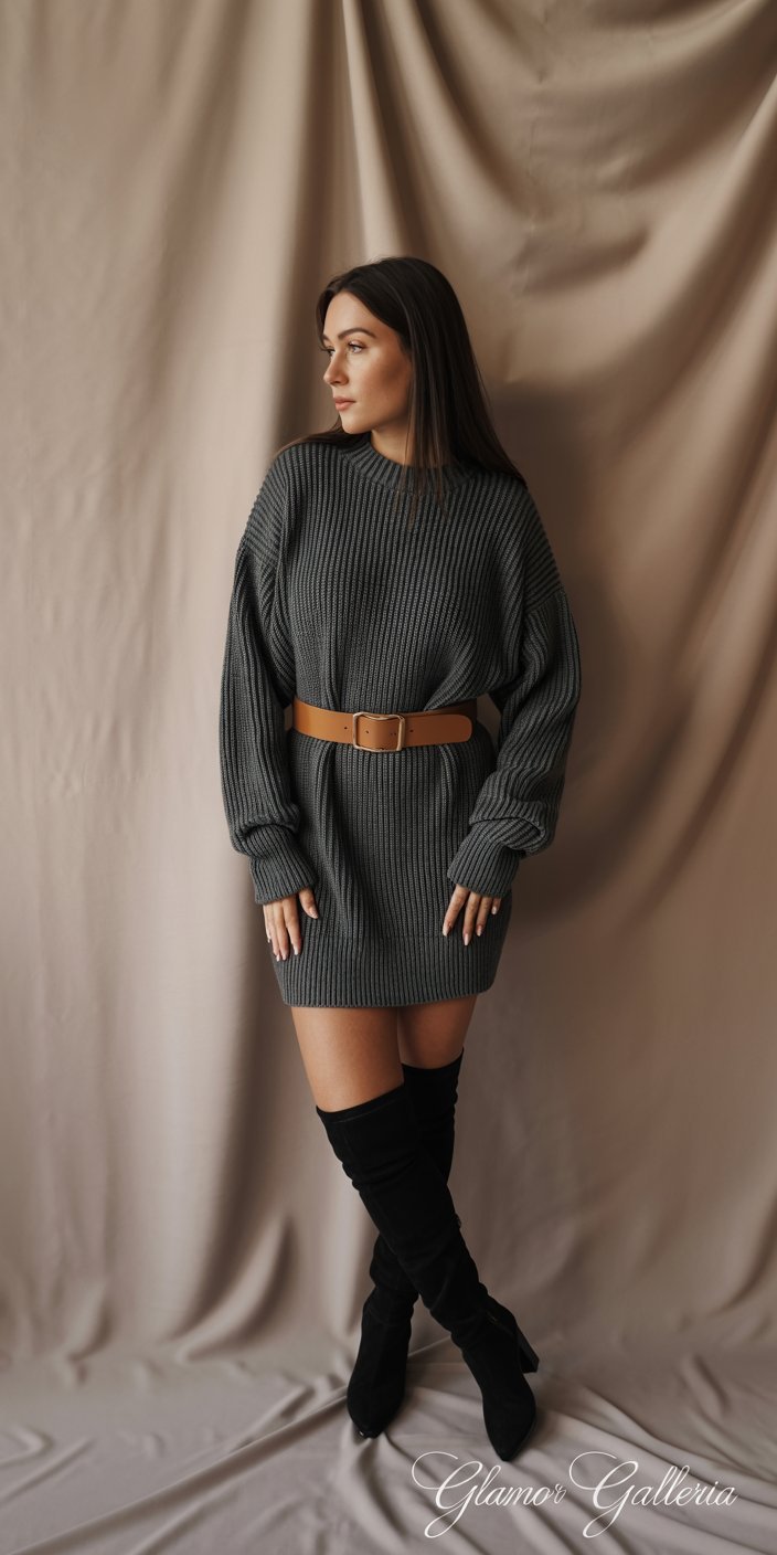 • Pro Tip: For extra flair, choose a belt in a contrasting color (e.g., tan belt on charcoal gray knit).