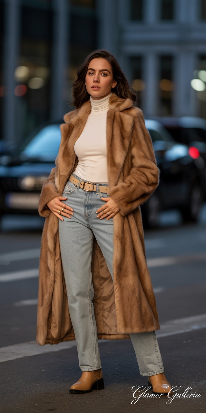 • The contrast between luxe fur and everyday denim creates an approachable, off-duty aesthetic.