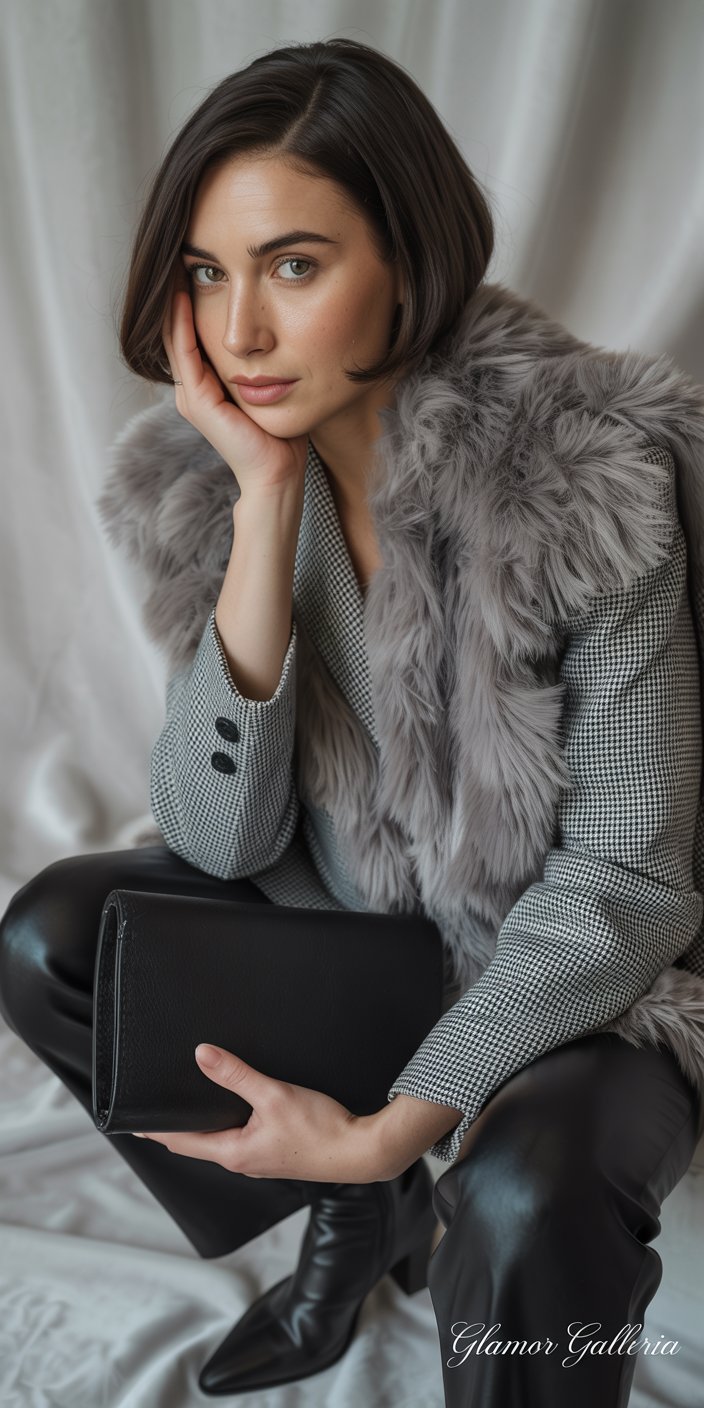 • A grey faux fur coat over a black-and-white houndstooth blazer, skinny leather pants, and ankle boots.