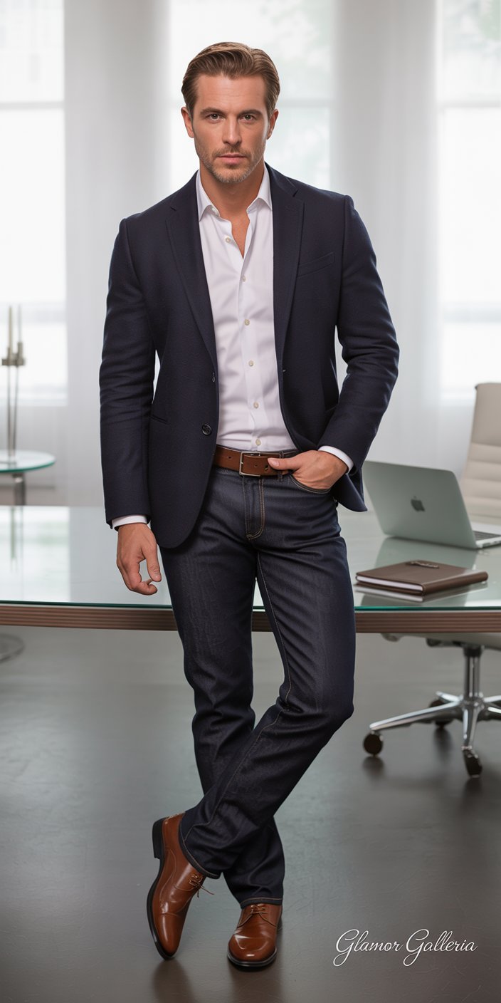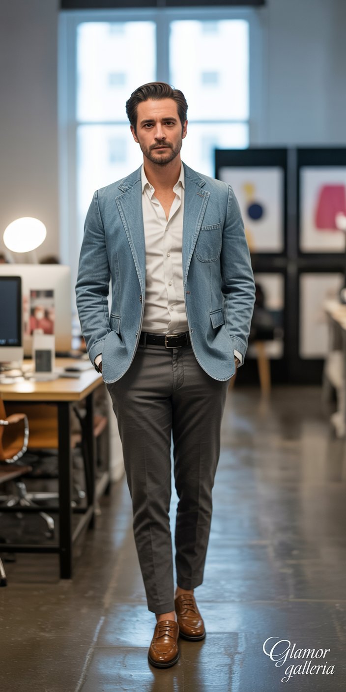 Denim jackets scream casual; adding a blazer twist brings structure without sacrificing edge. This hybrid is perfect for storytelling dinners or creative-industry meetups.