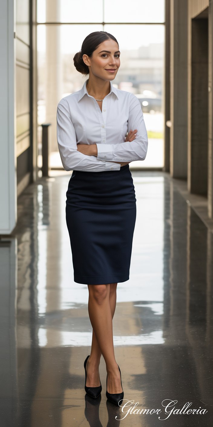 - Day: Crisp button-down or fitted blouse in cotton or polyester blend.