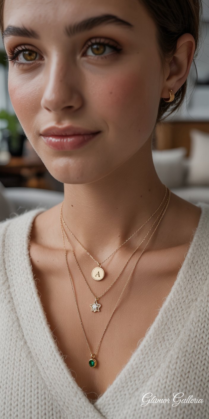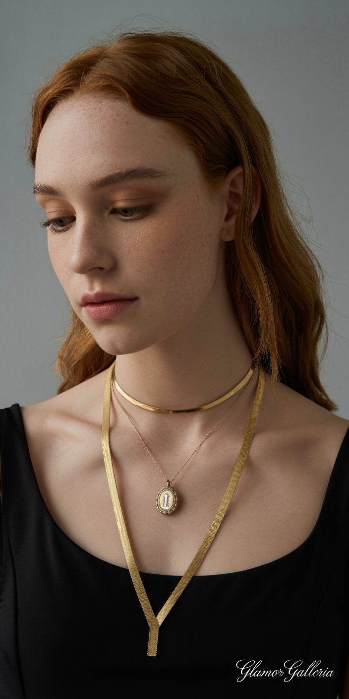 • Layer 2 (16–18″): Pendant necklace—think a gemstone or locket.