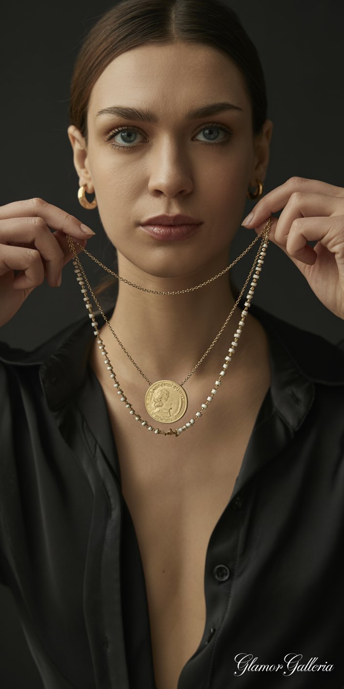 • Layer 2 (18″): Statement pendant (coin, cameo, oversized charm).
