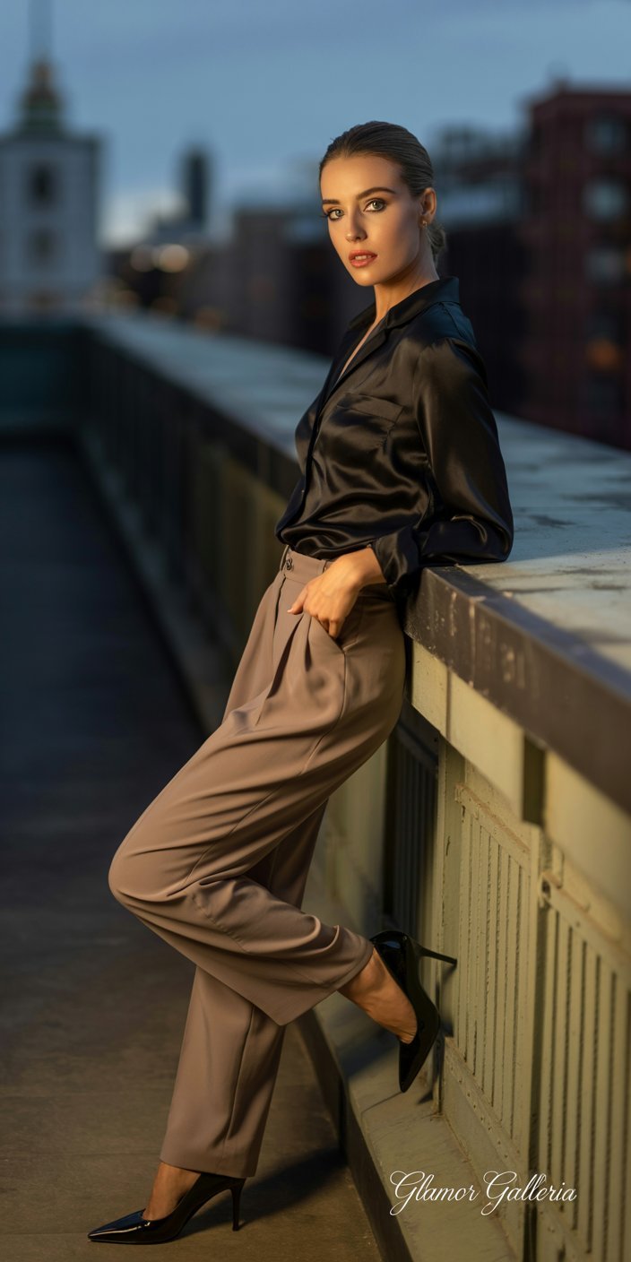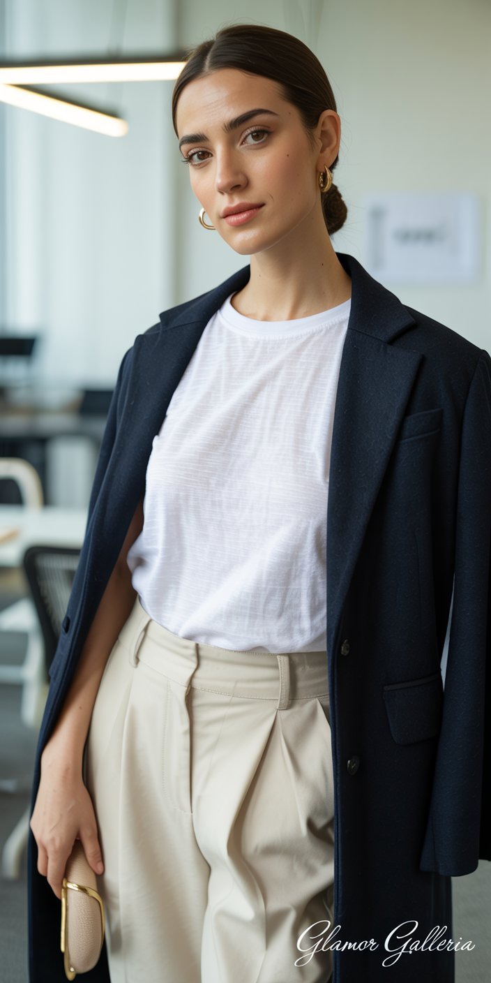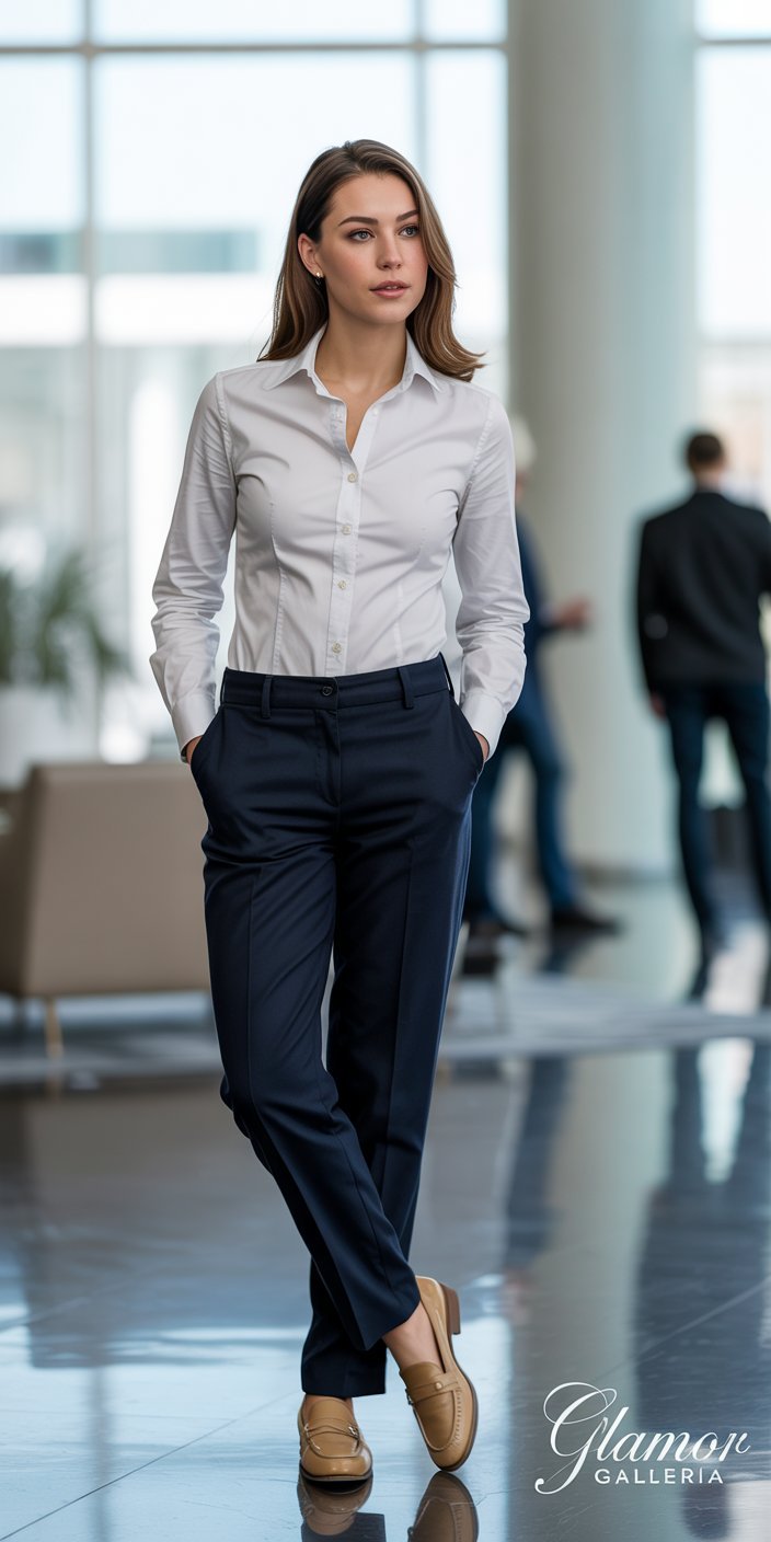 - Boardroom to Bistro: White button-down + tailored trousers + loafers → swap to pumps + silk earrings + clutch.